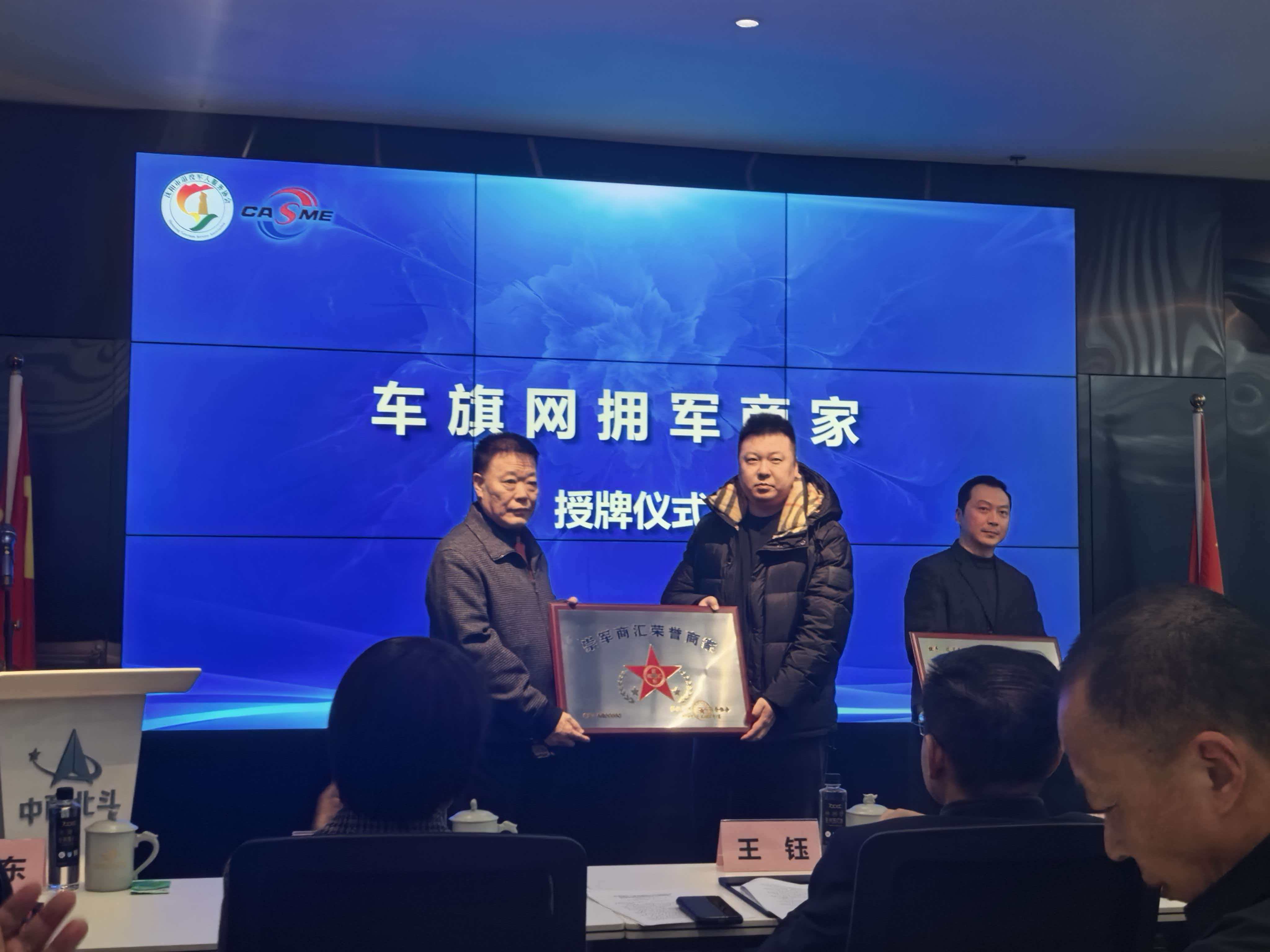 在全场嘉宾的共同见证下,车旗网负责人与退役军人事务部门代表郑重签署合作协议。随后,与会领导为车旗网授予“拥军商家”牌匾,鎏金牌匾上的字样熠熠生辉,既承载着对车旗网主动承担社会责任的认可,更镌刻着企业服务军人军属的郑重承诺。